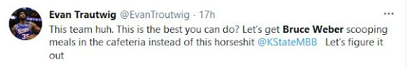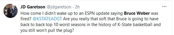 I’m long past the frustration and anger phases regarding K-State basketball. My friends and family know that my two favorite sports are college football and college basketball and that I never miss a K-State game whether it’s in person or on television no matter how bad the team may be. Instead of getting angry about this loss and letting it affect my mood, I try to find the humor in it. I watched Bruce Weber’s post-game press conference and read the transcript and decided I’m not going to break it down like I normally do. It’s the same stuff he says after every loss. Instead, since it was so popular last time, let’s do another version of Bruce Weber “mean tweets” from during and after the game last night…..